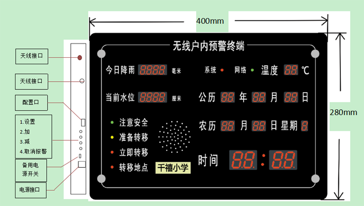 產(chǎn)品采用與家庭日常用品相結(jié)合的親民形式,具有公歷、農(nóng)歷、時間、星期、溫度等居民日常常用信息的顯示功能,可提高居民對設備維護的重視程度,便于居民及時掌握預警信息。